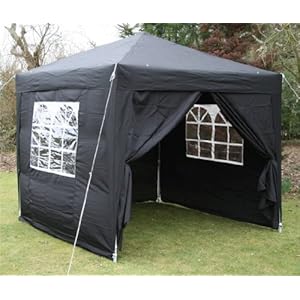 Fantastic Fully Waterproof BLACK pop-up gazebo 2.5mtr x 2.5mtr. Supplied with four side panels - two with church style windows, two with full length zippers, these can be attached in any combination allowing you complete freedom of location. Steel framed. Easy adjusting Guy ropes included. Supplied complete with a heavy duty zipped carrybag. WATERPROOF canopy manufactured from 190g PU coated soft touch polyester fabric with all seams taped sealed (as used in camping tent manufacture). Carriage: £10.00 within UK. This product is designed for Garden and Leisure activities. We have no control over the weather or ground conditions when this item is setup. Therefore it is the buyers responsibility to ensure that the erection and anchoring of this product is sufficient. As with all other products of this nature this item is designed as a temporary structure and should not be left up unattended or overnight when strong winds can cause significant damage. - Esc Europe Ltd cannot be held responsible for any damage incurred in this manner.